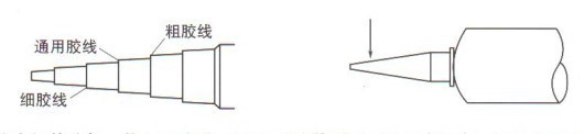 ? (3)根據(jù)密封面寬度和密封間隙來(lái)決定擠出膠條的直徑,選擇注膠嘴的尺寸,用刀截去,如下圖所示。用膠量不宜多,盡量減少擠出密封面之外的膠量;